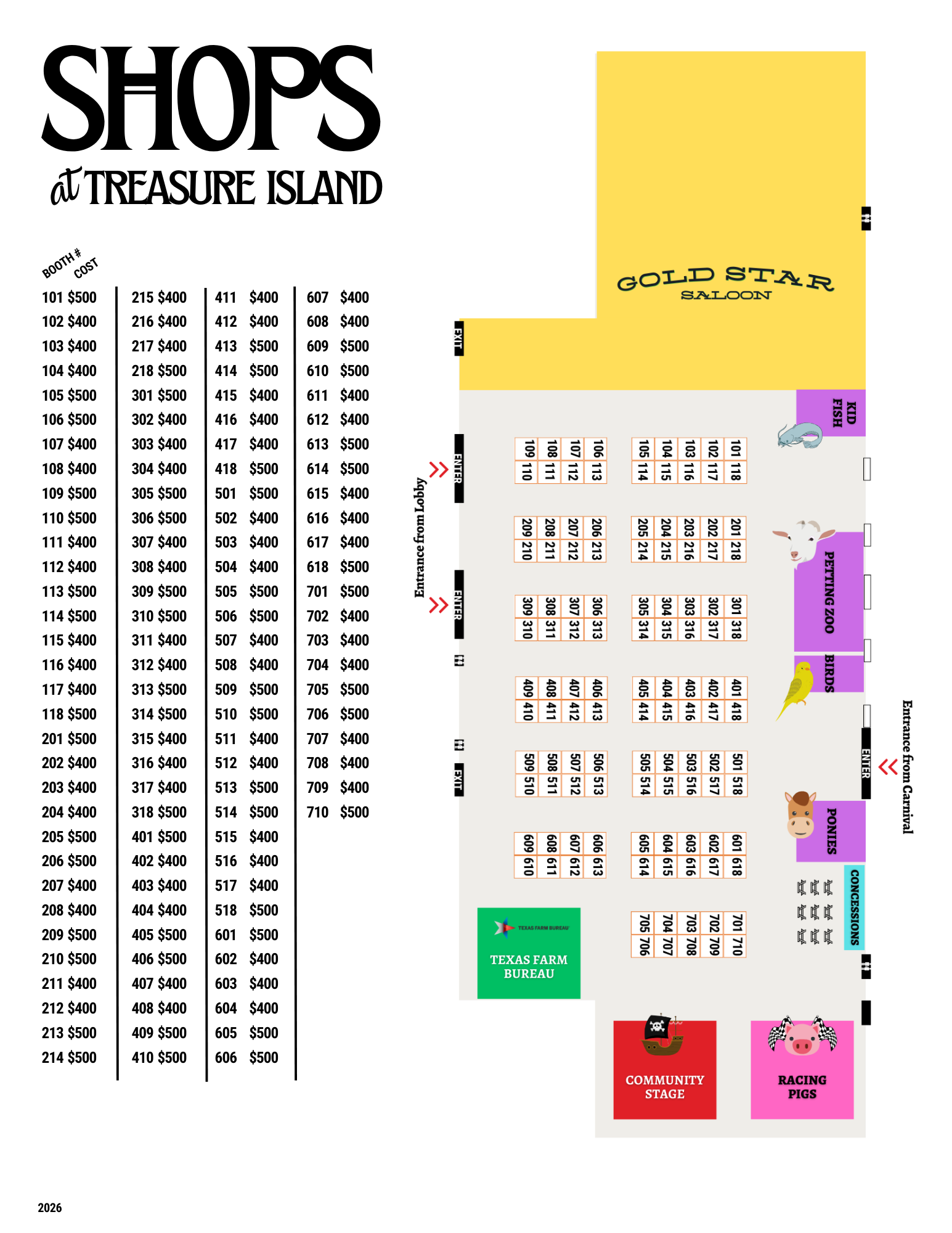 Access to The Shops at Treasure Island is included with gate admission and is easily accessible from the carnival, outdoor stage and Gold Star Saloon VIP Area.